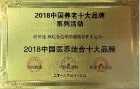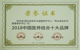 2018年3月,由中国国际养老产业博览会组委会联合相关行业协会、机构主办的2018中国国际养老产业发展高峰论坛上,燕达金色年华健康养护中心获评“2018 中国医养结合十大品牌”称号,并授予牌匾证书。