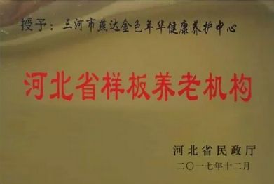 2017年12月,河北省民政厅授予燕达金色年华养护中心“河北省样板养老机构”。