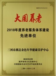 2018年12月,在国家养老网、国声智库文化发展中心、中国国际中老年艺术节组织委员会联合举办“大国养老2018年度养老服务体系建设先进单位”公益评选活动中,燕达金色年华健康养护中心被授予“大国养老2018年度养老服务体系建设先进单位”荣誉称号。