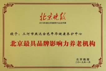 2019年1月17日,在北京晚报2018-2019年度传媒盛典上,燕达金色年华健康养护中心作为国家养老服务业发展典型案例,被评为“2018年度北京最具品牌影响力养老机构”。