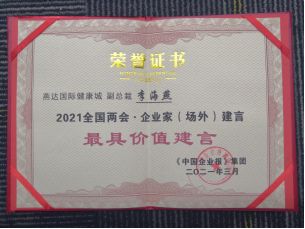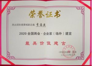 2020年5月,燕达国际健康城副总裁李海燕荣获“2020全国两会·企业家(场外)建言最具价值奖”。