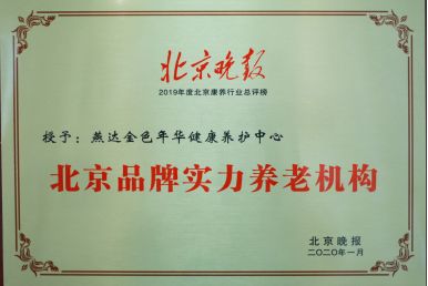 2020年1月,燕达金色年华健康养护中心在“2019北京晚报‘品牌实力养老机构’年度总评榜”活动中,被授予“2019年度北京品牌实力养老机构”。