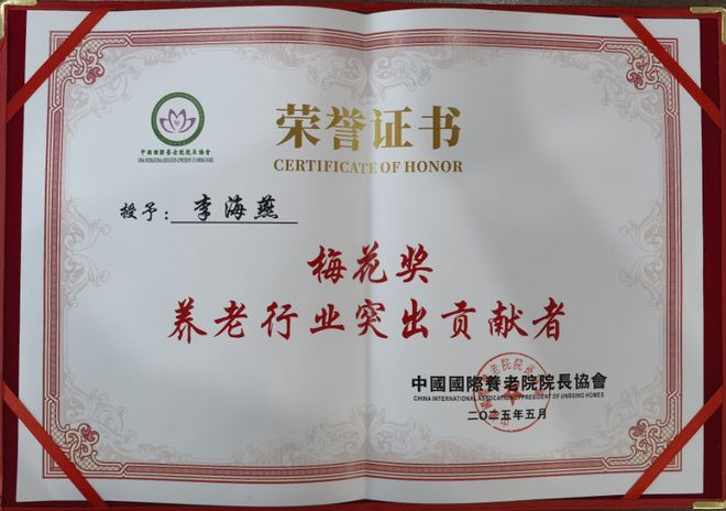 2025年5月5日,中国国际养老院院长协会授予李海燕“梅花奖养老行业突出贡献者”称号。