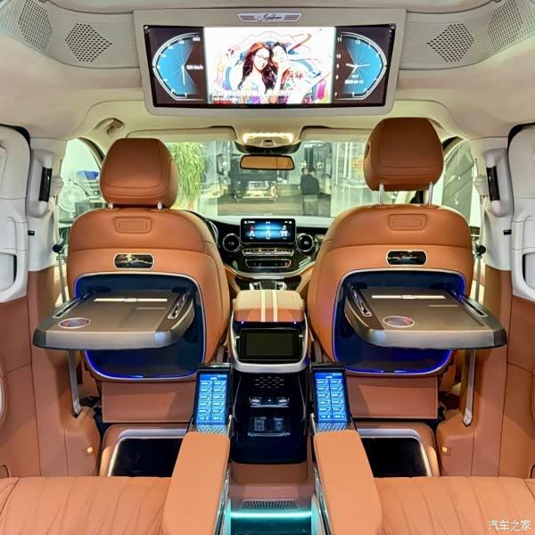 打开车门,踏入车内,仿佛置身于一座移动的豪华宫殿。车内空间布局合理且宽敞,得益于高顶设计,头部空间极为充裕,即使身材高大的乘客也能自在舒展,毫无压抑之感。内饰选用大量高品质材料,如顶级真皮、实木与金属等,每一处细节都展现出精湛的工艺与对品质的执着追求。座椅采用顶级真皮材质,触感柔软细腻,透气性极佳,且配备多向电动调节、通风、加热和按摩等丰富功能,无论长途旅行还是短途出行,都能为乘客带来极致舒适的乘坐体验。第二排的航空座椅堪称车内的“灵魂所在”,它不仅具备上述所有功能,还支持360度旋转。当旋转与第三排形成卡座设计时,搭配车内精致的氛围灯和可升降的小桌板,无论是商务洽谈重要合作,还是家庭温馨聚会,都能轻松满足需求,让每一段旅程都充满愉悦与惬意。第三排座椅同样采用高品质材料打造,并且可以灵活放倒,秒变舒适的沙发床。这一设计为长途旅行中的乘客提供了充足的休息空间,即使是身材高大的成年人也能舒展身体,安心入眠。同时,车内宽敞的空间也确保了乘客在车内的活动自如,不会感到丝毫的局促和压抑。